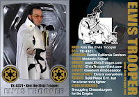 Ken: Apareci como Elvis Trooper depois de alguns amigos me terem "picado" perguntando se eu estava a tentar ser o Elvis com as minhas grandes patilhas;então eu comprei o meu primeiro par de óculos à Elvis por brincadeira.Tinha eu o meu traje de Stormtrooper à menos de um ano,quando numa manhã me surgiu a ideia de usar os óculos com o traje branco.