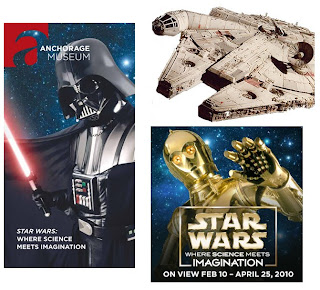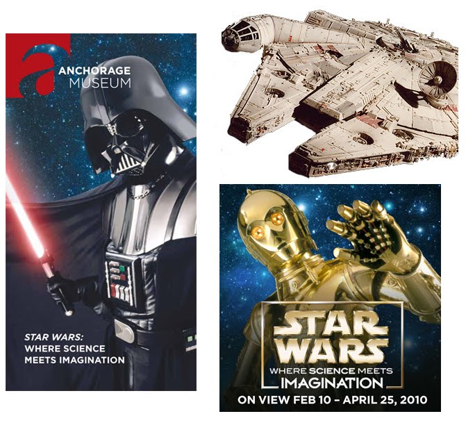 Uma nova exposição de Star Wars estará patente até ao dia 25 de Abril de 2010 no Anchorage Museum no Sul do Alaska;intitulada " Star Wars:onde a ciência encontra a imaginação" será apresentada pela Bose Corporation onde inclui uma grande variedade de experiências com alta tecnologia assim como mais de 80 objectos dos filmes,montagens-vídeo exclusivas,trajes dos personagens e mais de uma dúzia de exibições interactivas onde os visitantes poderão "saltar" para a velocidade da luz numa réplica do cockpit da Millenium Falcon que explorará uma Galáxia muito,muito distante...narrada pelo nosso conhecido Anthony Daniels.