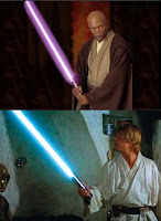 A cor que o sabre de luz emite é a mesma do seu cristal.As cores mais comuns utilizadas pelos Jedi são o azul e o verde embora alguns Jedi também usem outras cores como o amarelo ou o rôxo(Mace Windu);o sabre de luz vermelho é utilizado pelos Sith,representando a morte,o sangue e o poder.