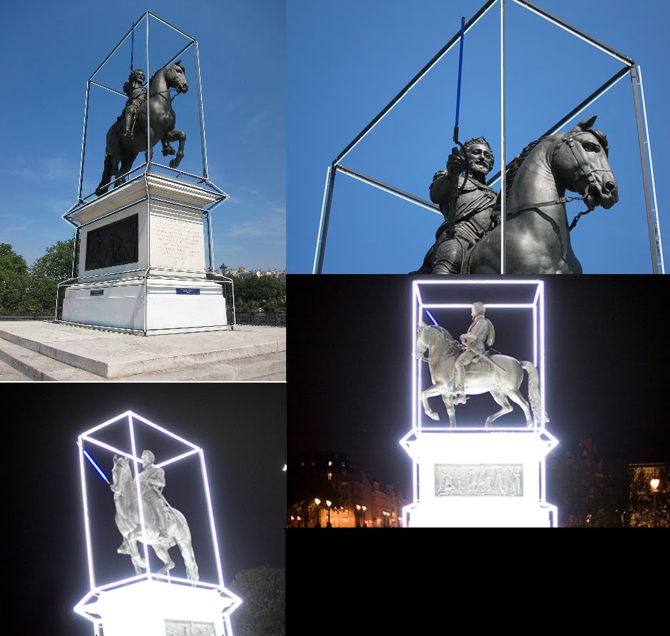O françês Jean Charles De Castelbajic,decorou recentemente a estátua equestre do rei Henrique IV que está situada no Pont Neuf em Paris.Estye novo look intitulado"Astronomy Domine"visa celebrar de forma original,o 400º aniversário da morte deste rei françês,adicionando-lhe um sabre de luz azul e uma caixa em neon branco;esta instalação esteve exposta até ao dia 14 de Julho.Fonte:http://www.highsnobiety.com/