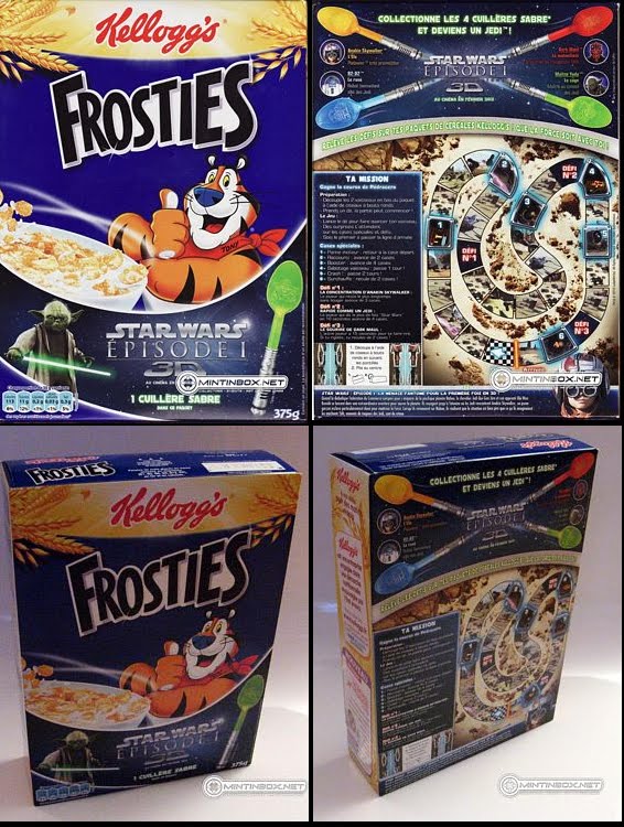 A Kellogg´s vai lançar uma gama de cereais da Frosties e Coco Pops com uma promoção relativa a Star Wars 3D.Nas embalagens destes cereais,virá uma colher fluorescente em que o respetivo cabo é um punho de sabre de luz;há quatro modelos diferentes referentes aos sabres do Anakin,Yoda,Darth Maul e um relativo ao dróid R2D2.Não sabemos ainda se esta promoção chegou ao nosso país,mas já está no mercado espanhol pelo que brevemente deverá cá estar também.Agradecemos aos nossos leitores que caso encontrem esta promoção em Portugal,que comentem aqui o local onde a viram e se possível com fotos.Fotos: http://www.mintinbox.net