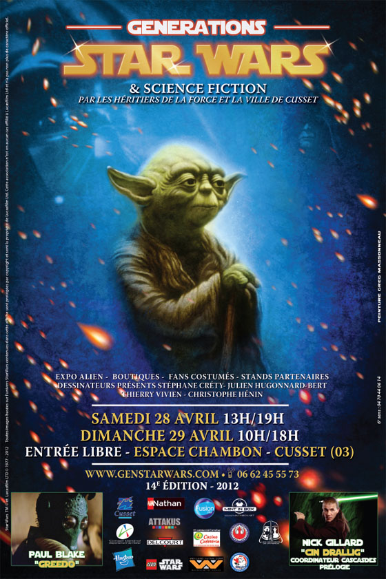 Nos dias 28 e 29 de Abril,irá decorrer no Espace Chambon perto de Vichy/França, a 14ª edição do certame Generations Star Wars & Science Fiction onde estarão presentes alguns convidados de renome como Paulo Blake e Nick Gillard.Mais informaçõaes acerca deste evento podem ser consultadas aqui: http://leblog.genstarwars.com/