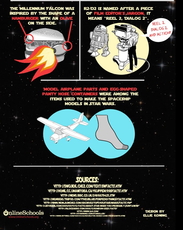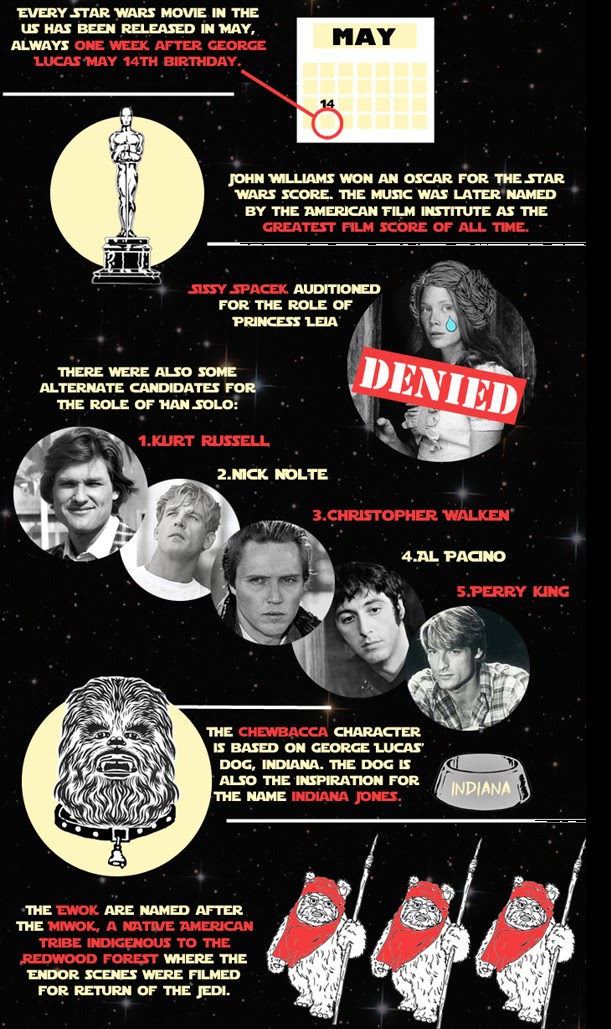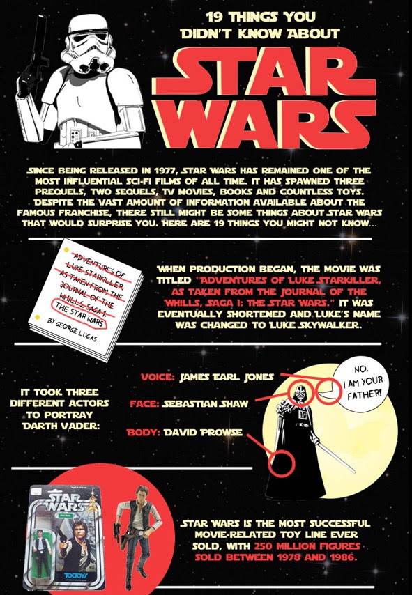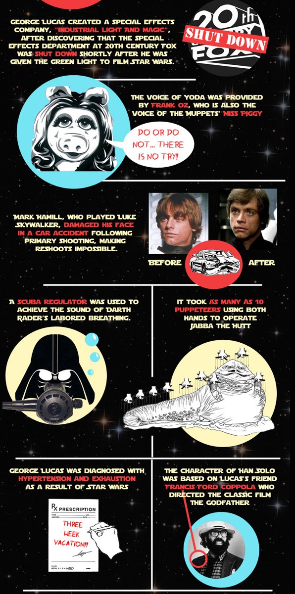 O Website http://www.tasteofcinema.com publicou 19 curiosidades em formato gráfico acerca de Star Wars que provavelmente nem os acérrimos fãs da saga desconheciam,como por exemplo:A voz do Yoda foi feita pelo mesmo ator (Frank Oz)que fêz a voz da Miss Piggy(Marretas) ou que foram precisas 10 marionetas para manobrar o Jabba the Hutt.E já agora,quantas figuras de personagens de SW foram vendidas em todo o mundo entre 1978 e 1986?250 milhões!Cliquem nas fotos para ampliar e verão todas estas curiosidades!