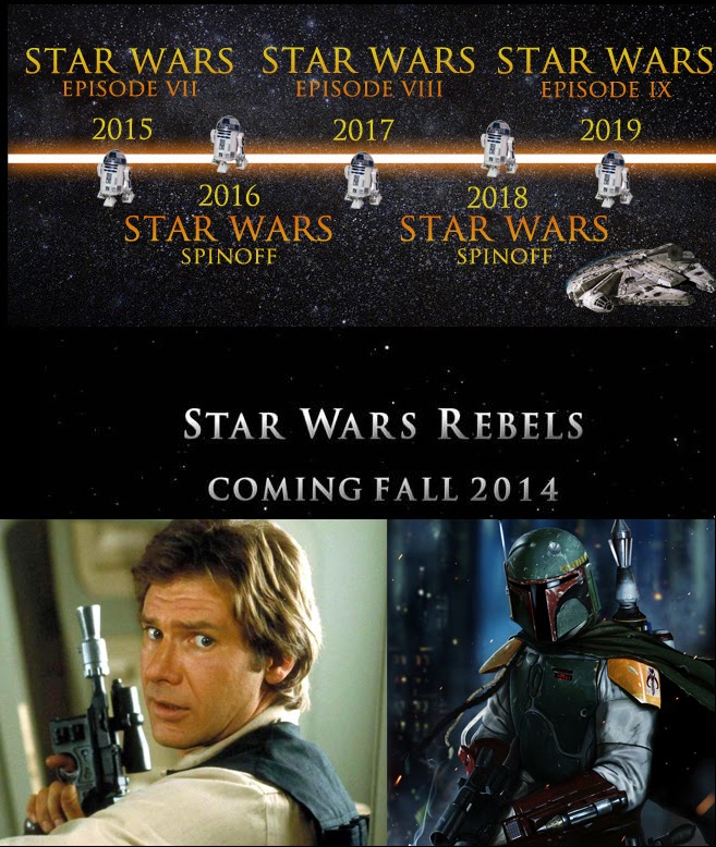 O Website Jobolo editou uma tabela gráfica das estreias dos novos filmes e spi-offs de Star Wars.De salientar que os Spi-Offs serão filmes biográficos dos personagens da saga,prevendo-se que os primeiros sejam relativos ao Han Solo e Boba Fett.A tão esperada série de animação Star Wars Rebels deverá estrear-se em 2014.