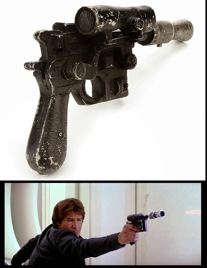 O Blaster DL-44 que foi usado por Harrison Ford nos episódios da clássica trilogia de Star Wars,foi leiloado pela Profiles in History e vendido por 200 mil Dólares!Este modelo foi baseado na pistola alemã Mauser C96 usada na 2ª grande guerra mundial.Fonte: