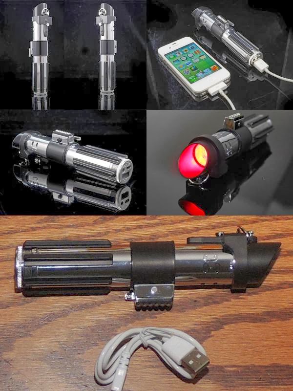tem à venda uma réplica do punho do sabre do Darth Vader que serve para carregar baterias de Smartphones,Iphones,etc.Traz um cabo USB incluido e uma bateria de Lithium.Dimensões: 16x4,2x3,1 cm.Preço: US§49,90.