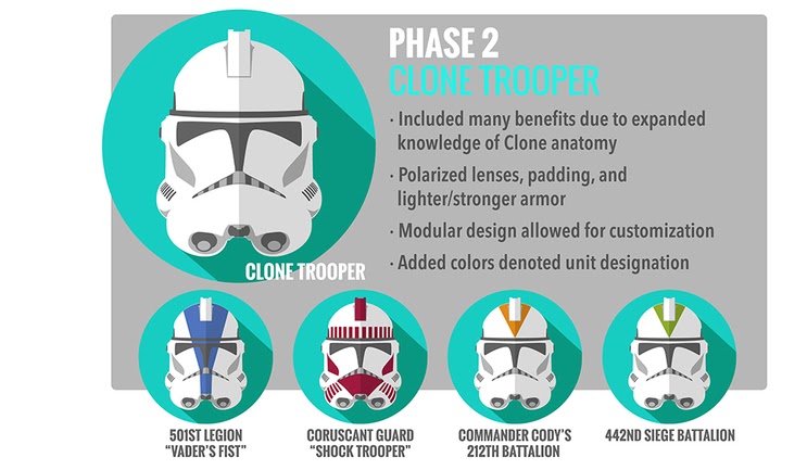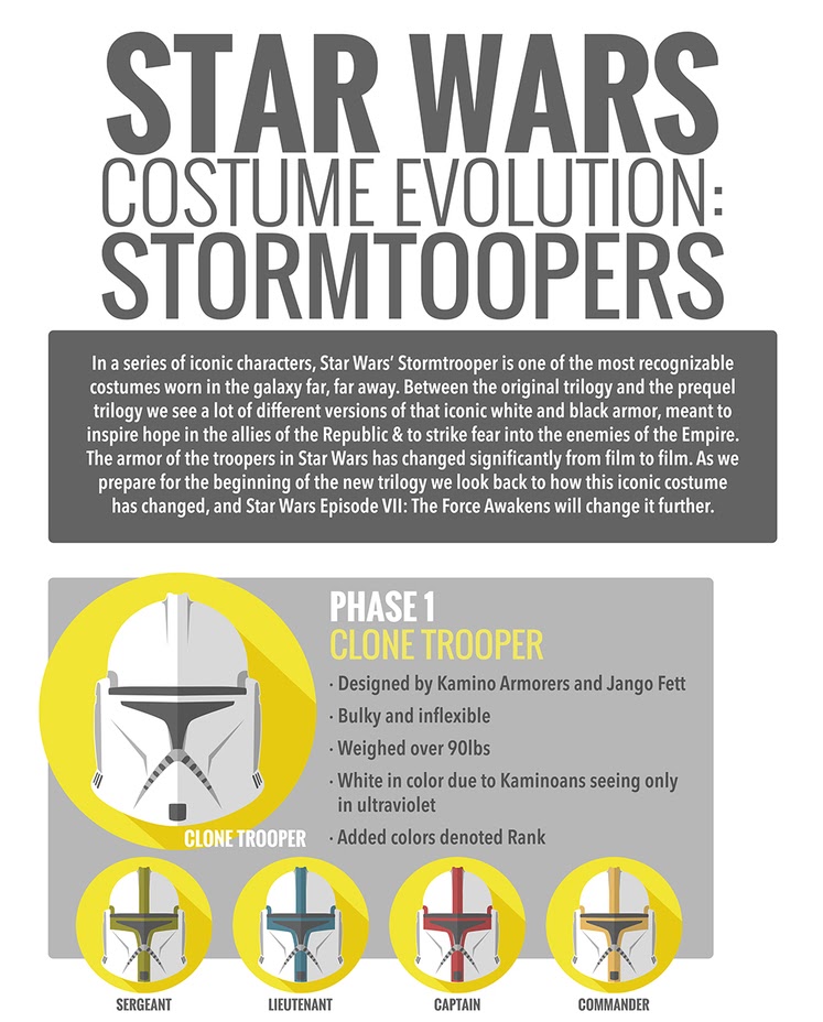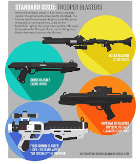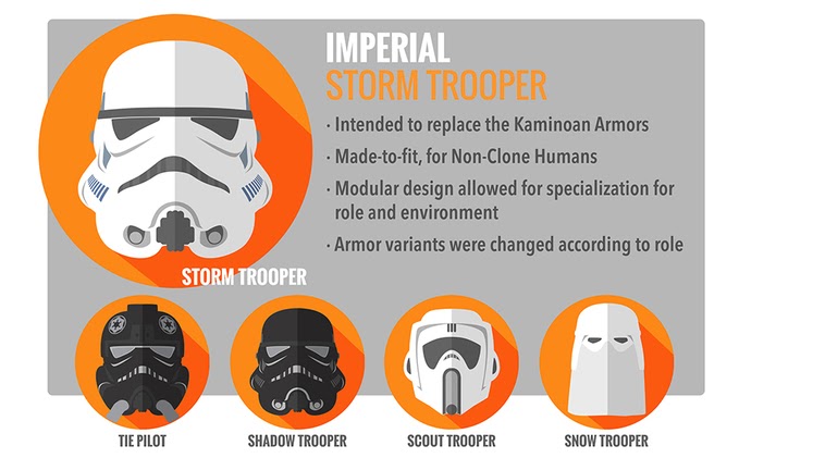 publicou um gráfico com imagens que explica a evolução do design das armaduras e blasters dos Stormtroopers,desde a Era dos Clones aos novos Stormtroopers da First Order.