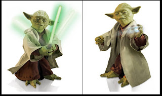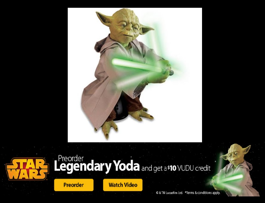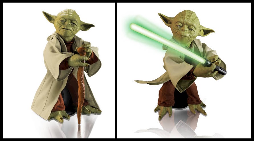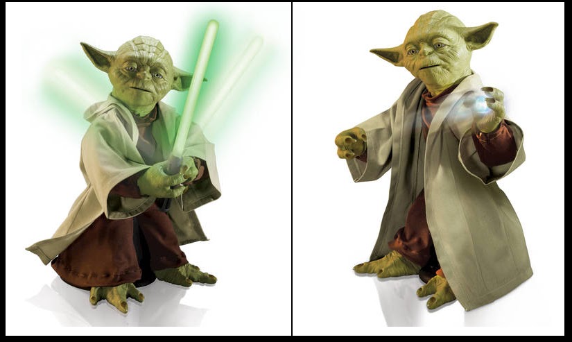 A Walmart tem em pré-venda a figura eletrónica com 16" (40 cm) do Mestre Yoda com reconhecimento de voz,115 frases,uma bengala,um sabre de luz que acende a respetiva lâmina e um robe fabricado em tecido.Inclui ainda um filme VUDU.Esta figura tem três modos de ação: Sabedoria,Força e Guerreiro.