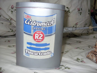 figura do R2D2 com 20 cm que foi alterada ficando com um aspecto sujo.Inclui uma lata de óleo a fingir.Tocando na cúpula do dróide acende uma luz.Preço: 25,00 euros.