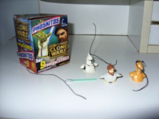 E também uma caixa Phoskitos de edição espanhola com 4 figuras de Star Wars-Clone Wars: Busto do Clone Trooper,busto do Obiwan Kenobi,busto do C3PO e sabre de luz.