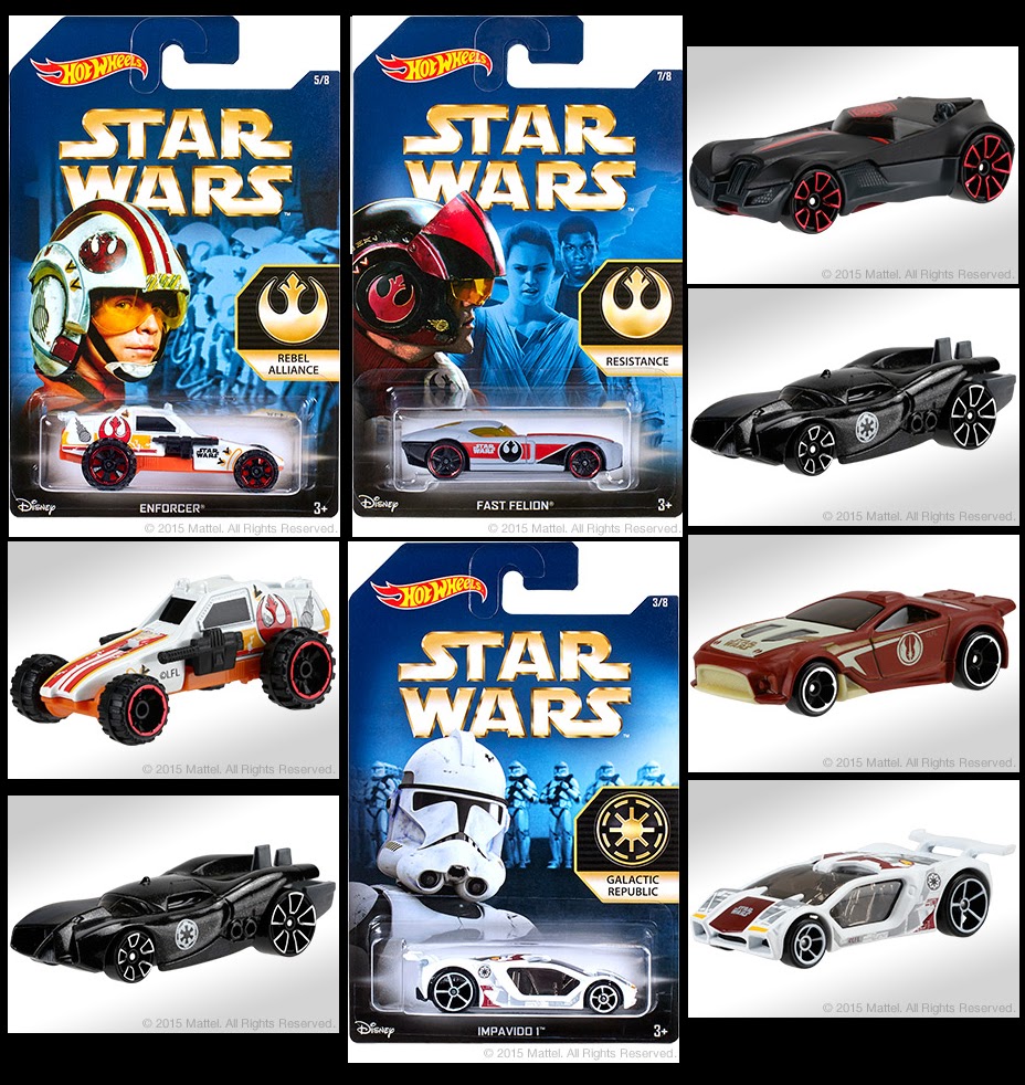 A Mattel lançou uma nova coleção de 10 viaturas Hot Wheels de Star Wars,sendo duas delas do episódio VII: Ettorium/First Order) e Fast Felion(Resistance).Fonte: Mintinbox.net