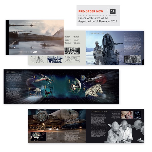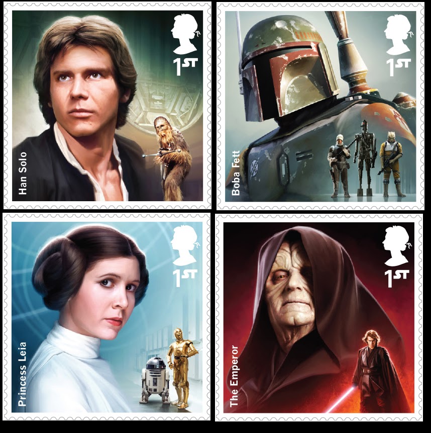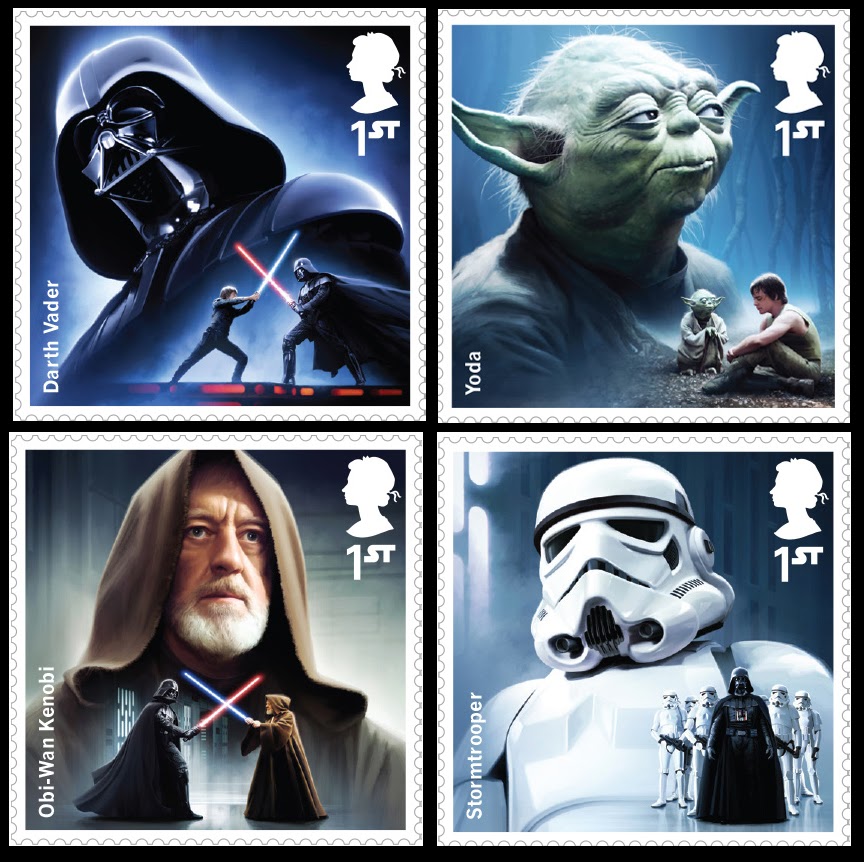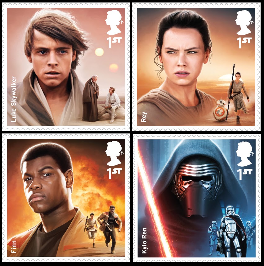 A Royal Mail-Os correios oficiais do Reino Unido,vão lançar a partir de 20 de Outubro,uma coleção de 12 selos com os personagens da saga Star Wars,sendo três deles de `O despertar da Força´.Estarão também disponiveis um albúm para a colocação dos selos e albúns individuais com 10 selos de cada personagem:Yoda,Han Solo,Vader e Boba Fett,entre outros lançamentos.Depois de 17 de Dezembro,será emitido um albúm "Prestige" com 26 páginas dedicadas aos atores britânicos que participaram em Star Wars.Mais informação em: www.royalmail.com